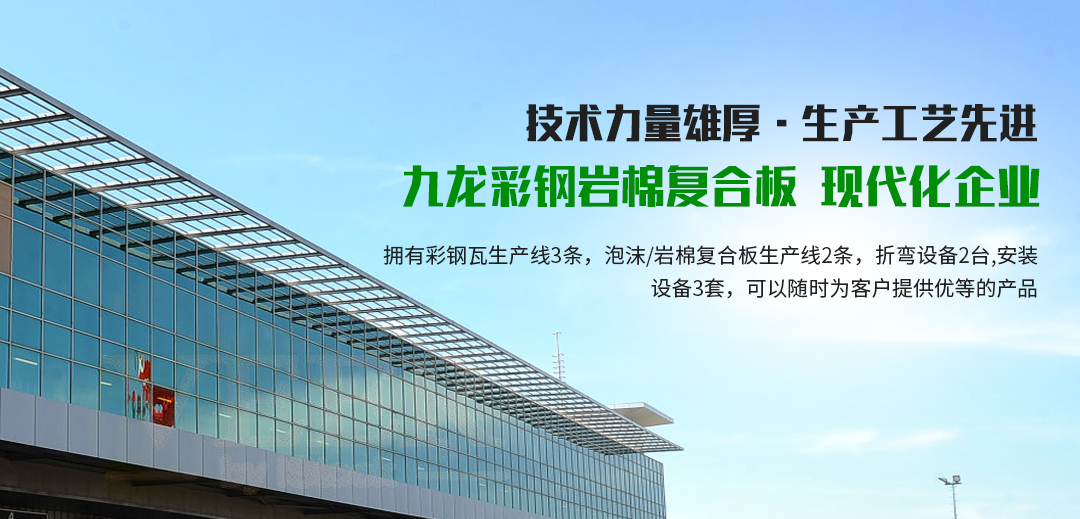 文登区九龙彩钢岩棉复合板厂位于威海文登市开发区龙山路和九龙路交汇处,九里水头桥北,东亚机械厂内,出入快捷、交通便利,地理位置优越。我厂是集生产、加工、及安装、设计一体的现代化企业,主要生产销售彩钢瓦,岩棉复合板,防火彩钢板,彩钢复合板,泡沫复合板。该厂成立于2011年,专业生产彩钢岩棉板已有近十年的历史,积累了丰富的实践经验,技术力量雄厚,生产工艺选料精良,质检严格。拥有生产车间2700平米,技术人员20多名,主要生产销售彩钢瓦、泡沫复合板、岩棉复合板、C型钢、方管等钢结构配件。拥有经验丰富团结创新的职工队伍,拥有整套现代化的生产设备,拥有彩钢瓦生产线3条,泡沫/岩棉复合板生产线2条,折弯设备2台,安装设备3套,可以随时为客户提供优等的产品。九龙彩钢以合格的产品和真诚的笑容竭诚欢迎新老客户来公司洽谈合作,以质优的产品服务于用户,以经济实惠的价格满足于用户,为您的事业发展贡献我们的力量。